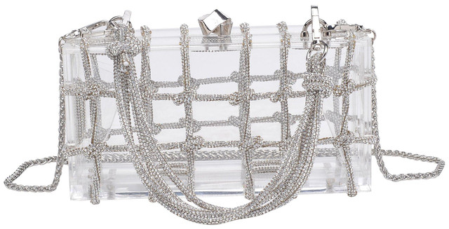 This Mini Crossbody Bag features a clear lucite case encased in metallic cord, a top snap closure, a detachable crossbody chain, a detachable shoulder cord, and an unlined interior. Measures approximately 8 in. L x 2.5 in. W x 4 in. H. WARNING: CANCER AND REPRODUCTIVE HARM - WWW.P65WARNINGS.CA.GOV.
