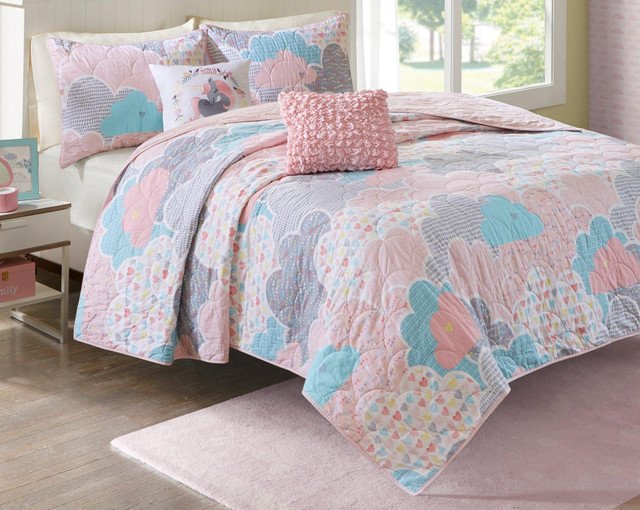 Urban Habitat Kids Cloud Coverlet Set features various cute and fluffy clouds in a colorful a palette of pink, aqua, and white. The coverlet reverses to a solid, soft pink. One pillow features all over ruching and the other features an embroidered unicorn. Set includes coverlet, 2 shams (1 twin) & 2 decorative pillows. Pillows measure: 12'' x 16'' and 16'' x 16''.