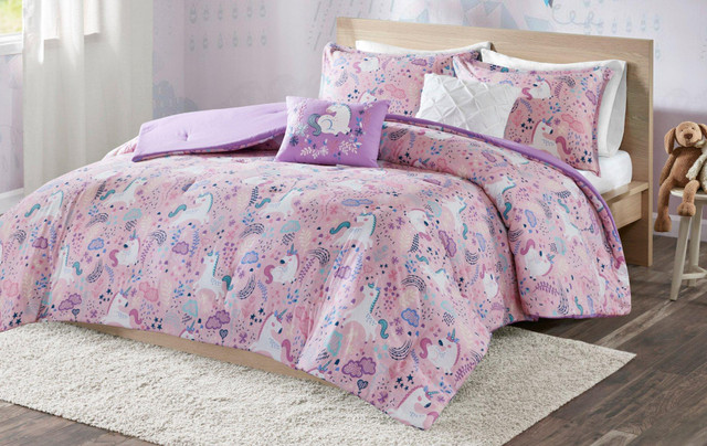 Fill your bedroom with the sweet and whimsical charm of the Urban Habitat Kids Lola Cotton Printed Comforter Set. Comforter features adorable unicorns across the top of the comforter and matching shams in bright colors on a pink ground. Reverses to a solid purple. Set includes comforter set, 2 shams (1 twin), and two decorative pillows. Pillows measure: 12 x 16 and 16 x 16.