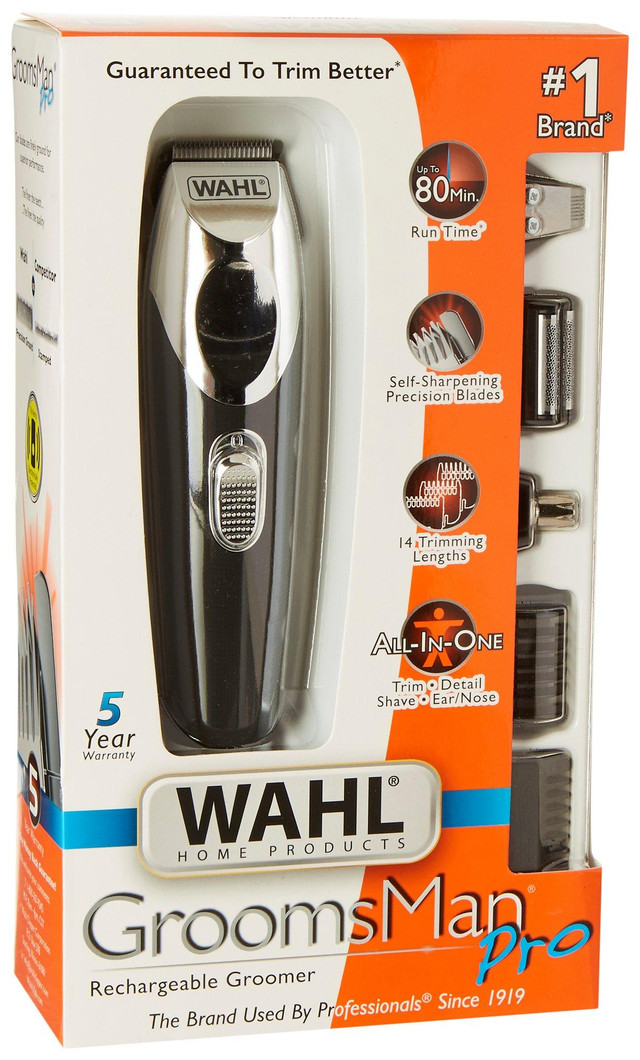 This grooming set from Wahl features an all-in-one package including a trimmer, detail shave, & ear/nose trimmer. Up to 80 minutes run time & 14 trimming lengths.