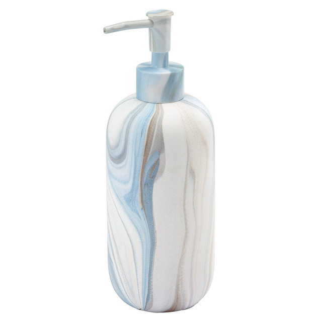 The Avanti Waves Blue Lotion/ Soap Dispenser features a multi-color marble-look design in shades of blue, brown and white with matching pump. The decal is applied randomly on the ceramic base--each piece is unique. Perfect for bathroom, kitchen or office. Shop the entire Wave Collection to add a trendy feel to your coastal decor.Dimensions:2.95 x 2.95 x 8.25