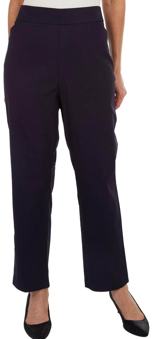 These pull-on pants feature a solid design on lightweight comfort stretch fabric, a hidden elastic waistband for optimal comfort, a slimming tummy panel, two front pockets, two back pockets, and slim fit. Inseam measures approximately 29 inches. Fabrication 75% rayon, 22% nylon, 3% spandex.