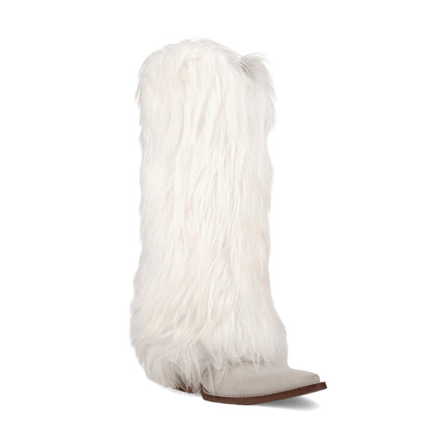 Unleash your Bad and Boujee style with the Snuggles leather boot. This 18-inch showstopper will have you cozy and stylish this season. The suede leather vamp is beautifully accented with a fluffy faux fur shaft, creating a luxurious and eye-catching contrast. With a 2 1/2-inch heel and a sleek snip toe, these boots are not just a statement piece; they're a fashion essential for those who dare to stand out.