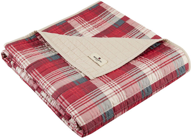 The Woolrich Tasha quilted throw features an all over red and tan plaid and reverses to a solid tan color. Made from 100% cotton this lightweight throw is soft to the touch and can be used year round. Measures 50'' x 70''.
