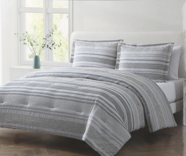 ZEST Kitchen+ Home is designed to help you celebrate life every day. Our passion for quality embodies every product, providing timeless style with a modern touch. Only available at Bealls Florida! This comforter set features a light striped design with embroidered details, 1 standard size comforter (full measurements for each size in traits) and two shams (1 included with the twin set.) Fabrication is cotton and polyester. Certified STANDARD 100 by OEKO-TEX.