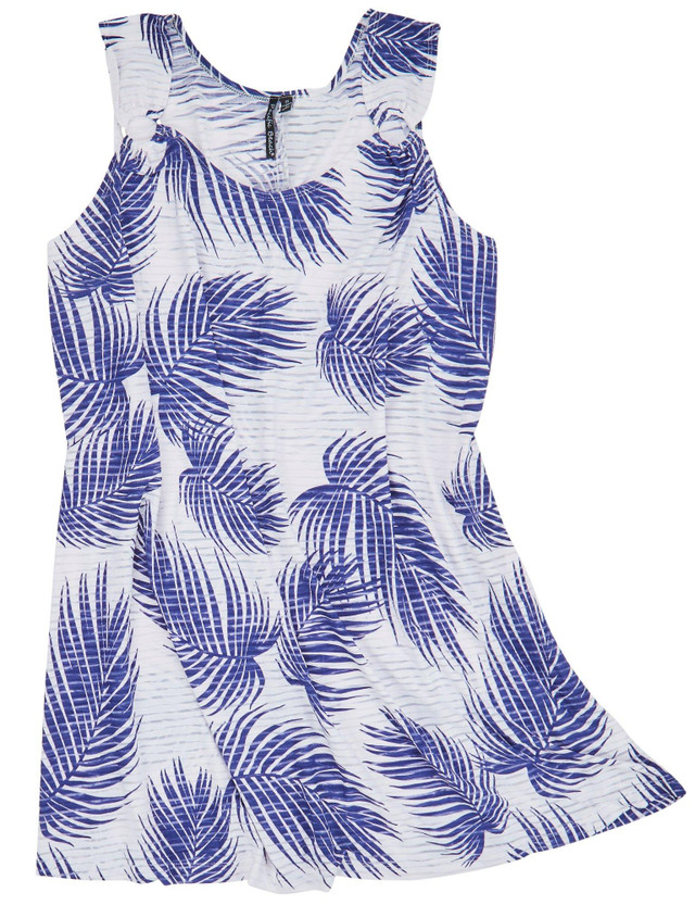 Get ready for your next beach or pool adventure in this stylish coverup dress! It features burnout fabric accents, a colorful palm print pattern, and metallic shoulder o-ring details. Fabrication 97% polyester, 3% spandex.