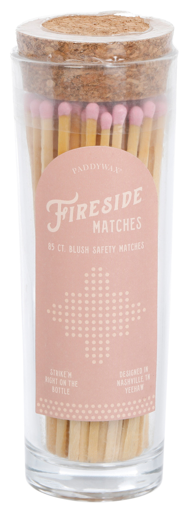 A jar of 85 extra-long safety matches in blush. Each match measures 5.25 inches, ideal for safely lighting candles or fireplaces, with a striker strip on the back of the bottle.