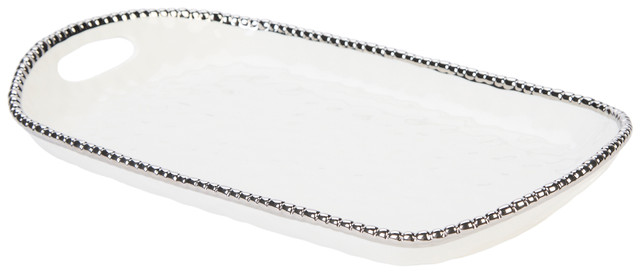Serve with elegance using this Rectangular Tray with Handles. Made from premium porcelain, it features a sophisticated silver bead trim and a design thats stain-resistant, scratch-resistant, and tarnish-freeperfect for stylish entertaining and everyday use. Measures 19 in x 11.5 in x 2 in