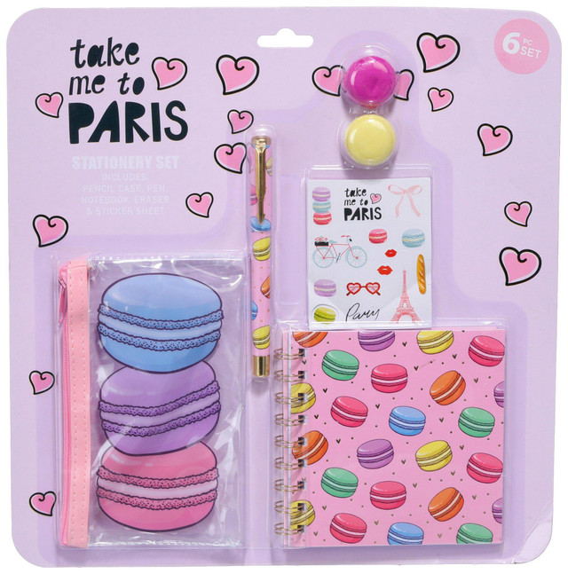 The Stationery Take Me To Paris Set with a Macaron Design brings a touch of Parisian charm to your stationery collection. This delightful set includes a stylish pen, a chic journal, two erasers, a cute pencil case, and a pack of vibrant stickers, all adorned with a whimsical macaron design. Perfect for adding a sweet and colorful flair to your everyday essentials!