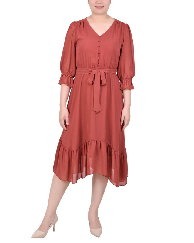 Welcome the warmer weather with femininity and style with this softly printed dress from NY Collection. Balloon sleeves and wide flounced hem add to the soft styling.