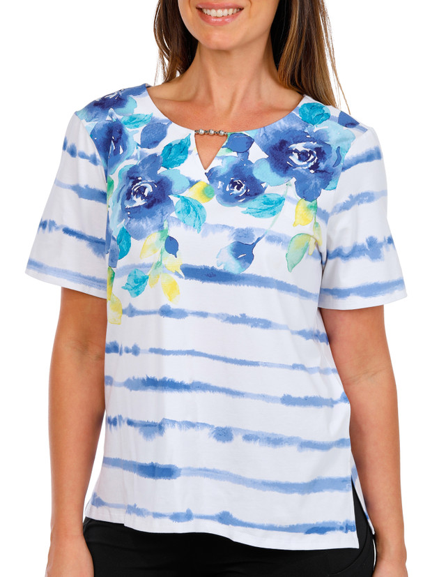 Painterly stripes in soft blue set the stage for blossoms that bloom across the neckline and shoulder. The split neckline frames the face with ease, while short sleeves and a straight hemline keep the fit light and flattering. A fresh mix of pattern and detail, this tee feels both playful and polished. Fabric: 95% Cotton, 5% Spandex. Machine wash cold, line dry.