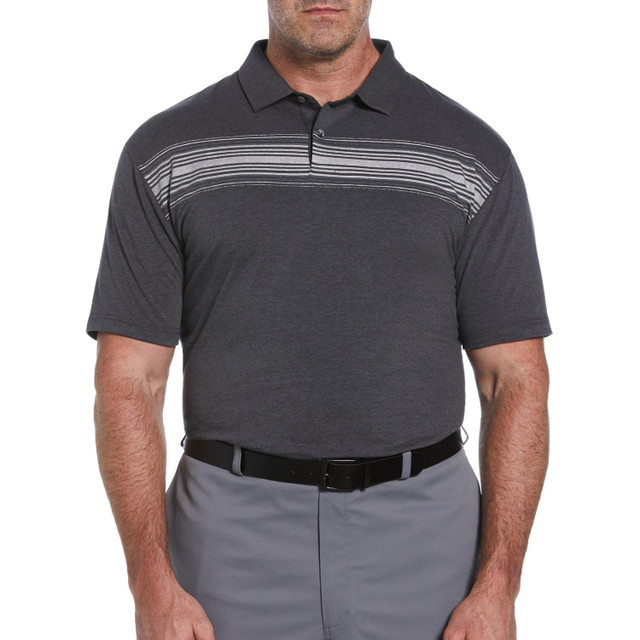 This Polo is high performance material and a fashion forward print add versality to this polo. Airflux and moisture wicking help keep you comfortable and dry as you play. Sun protection helps to guard against damaging UV rays, while stretch shoulder seams allow you to swing smoothly. Machine washable and easy to wear, this stylish short sleeve golf polo looks great on and off the course. Fabrication 92% polyester, 8% elastane.
