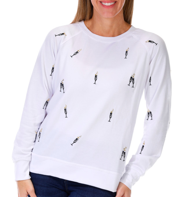 Celebrate the season in the Petite Champagne Long Sleeve Sweatshirt. A white crew neck long sleeve fleece knit sweatshirt featuring rhinestone embellished embroidered champagne glasses. This cozy sweatshirt is perfect for festive gatherings or casual winter wear. Fabrication is 83% polyester, 12% rayon, 5% spandex. Length measures approximately 24 in.