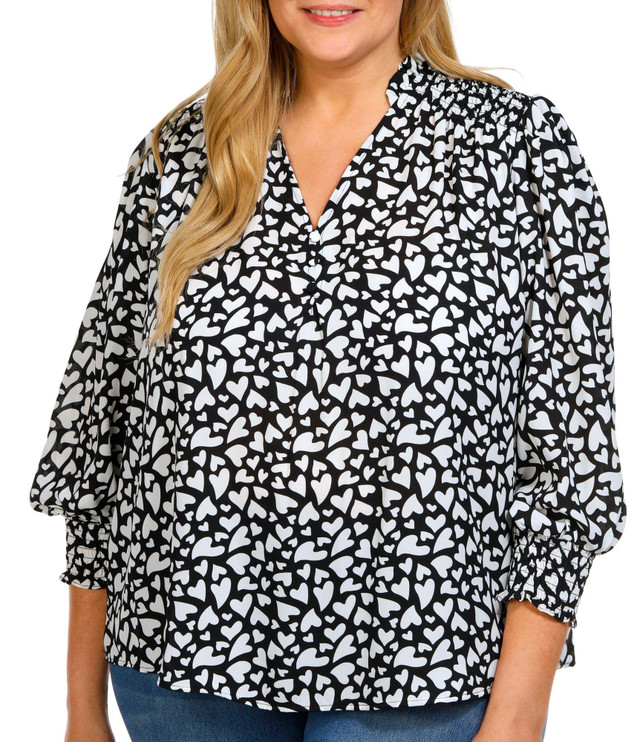 Introducing our Plus Heart Print 3/4 Sleeve Top, crafted from 100% polyester. This stylish top features smocked detailing on the collar, a button-down placket, 3/4 sleeves, and a charming ruffled collar. Perfect for any occasion, it offers a comfortable fit and a touch of elegance to your wardrobe.