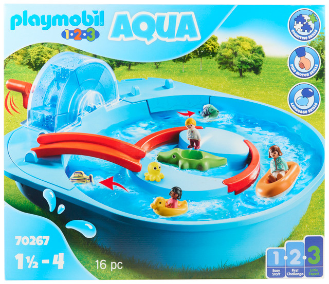 This kids water toy features a circular water tub where characters can sit in floaties and move around the water. The 16-piece set encourages fine motor skills, language development, and cognitive growth, making playtime both fun and educational. Measures 21.65 in long.