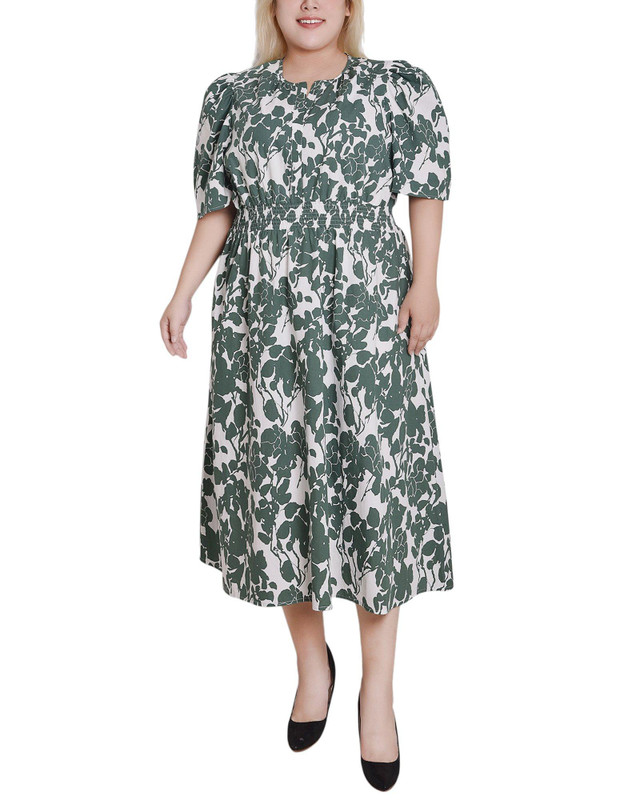 Embrace elegance with this puff sleeve poplin dress, featuring a sophisticated V-notched neckline and a smocked waist for a flattering fit. The midi length and elegant floral design make it perfect for both work and evening outings. This versatile dress combines timeless style with modern sophistication, ensuring you look chic and polished for any occasion. Length measures approximately 46 in. Fabrication 100% cotton.