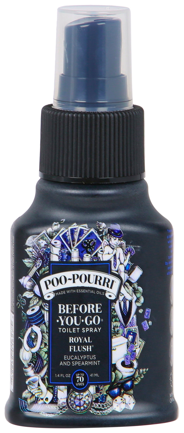 Poo-Pourri Before You Go toilet spray in a Eucalyptus and Spaermint scent. Spritz 3-5 sprays into the toilet bowl on the water's surface. All you'll smell is a refreshing bouquet of natural essential oils. 1.4 fl. oz. Up to 70 uses.