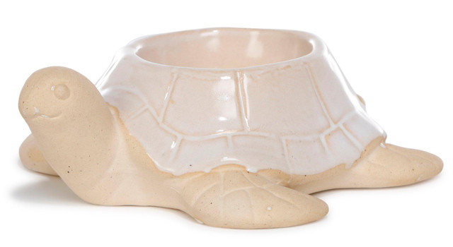 Bring ocean inspired warmth to any space with the Ceramic Sea Turtle Candle Holder featuring a coral pink finish and sculpted turtle shape. Designed to hold candles up to 2 inches in diameter or standard tea lights. Fabrication is ceramic. Measures approximately 4.5 in x 4 in x 1.5 in.