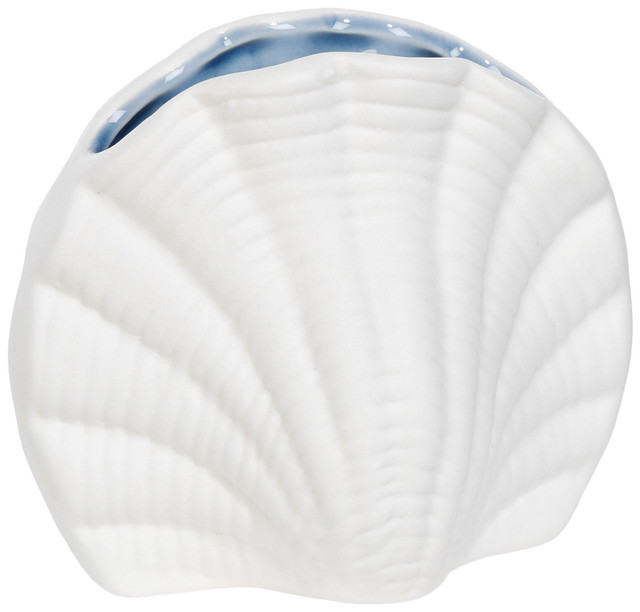 Accent coastal spaces with the Small Ceramic Seashell Bud Vase shaped like an open clam shell with a white exterior and glossy blue interior. Designed to hold buds, faux stems or dried flowers with subtle seaside charm. Fabrication is 100% ceramic. Measures approximately 3.5 in x 4 in x 2.75 in.