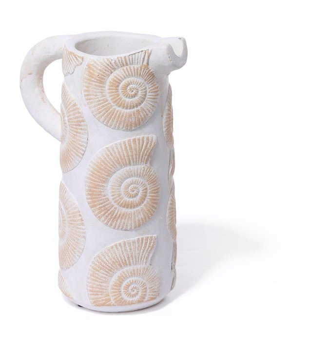Add a touch of coastal elegance to your serveware with the Nautilus Shell Pitcher. Measuring approximately 9.5 in x 4 in, this pitcher features a sculpted shell-inspired design that brings ocean vibes to any table. Ideal for serving water, iced tea, or cocktails, it also doubles as a decorative accent when not in use. Lightweight and easy to handle, its perfect for both everyday use and special occasions.