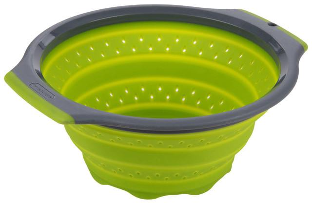 Wash and strain fruits, vegetables, pasta and more with this 3-Quart Silicone Collapsible Colander. This all-purpose colander is made with flexible silicone and can withstand both hot and cold liquids. It's constructed with soft-grip handles for comfortable handling, raised feet for faster water draining and collapses to 1 inch for compact storage.