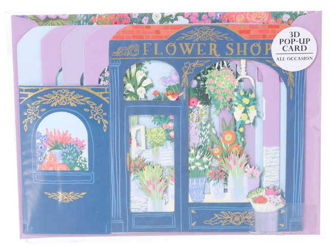 This all-occasion 3D pop-up card showcases a charming flower shop on the front. Includes space for a personal message on the back and comes with an envelope. Measures approximately 6.5 in x 5 in.