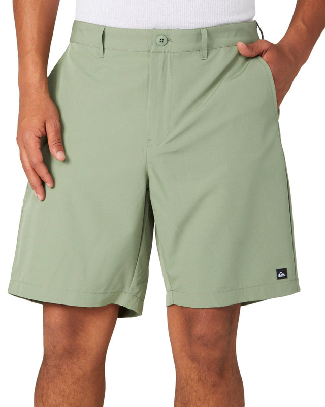 These union amphibian surf shorts feature anti-rash free stretch fabric, solid color design for easy matching, one button thru back pocket, one zip closure back pocket, hyper dry fast drying time, button-fly and zip closure, and regular fit. Outseam measures approximately 21 inches above the knee. Fabrication is 92% polyester, 8% elastane.