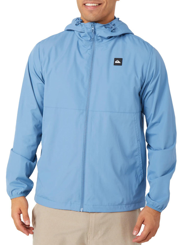 This mens windbreaker jacket features a full zipper, side pockets, and a hood with drawstring for adjustable coverage. The solid color design offers a sleek versatile look, making this jacket ideal for outdoor activities, casual wear, or layering in changing weather. Fabrication is 100% polyester.