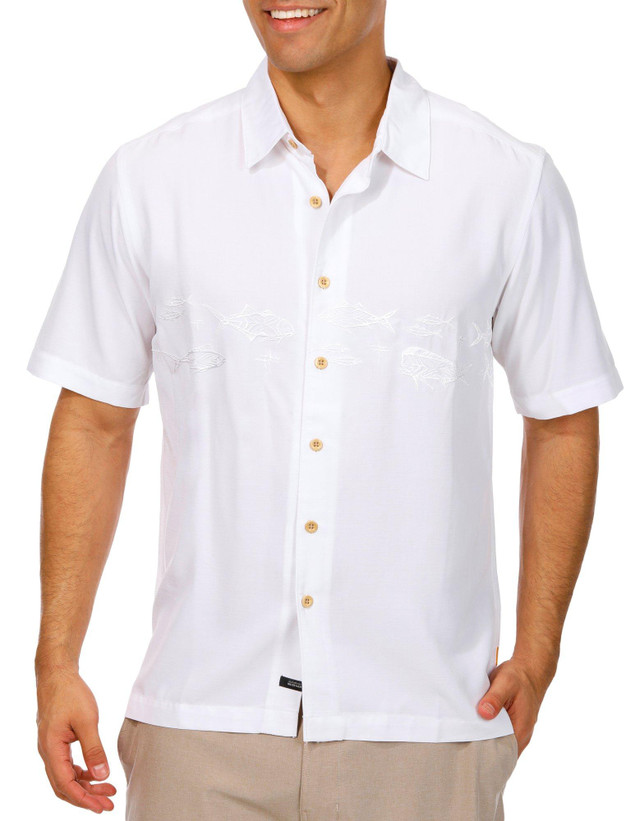 Add a touch of coastal charm with this Men's Embroidered Button Down Shirt. Featuring short sleeves and a detailed embroidered fish design, it is perfect for relaxed days and casual outings. Fabrication 85% modal, 15% polyester