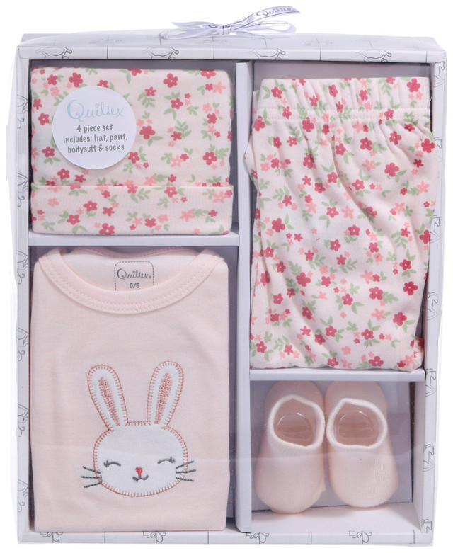 Introducing the Baby Girls 4 Pc Bunny Bodysuit Set, crafted from a blend of cotton, elastane, and polyester for a soft and comfortable feel. This adorable set includes a short sleeve bodysuit with an embroidered bunny design on the chest, floral pants, a matching floral hat, and cozy socks. Perfect for keeping your little one stylish and comfortable.