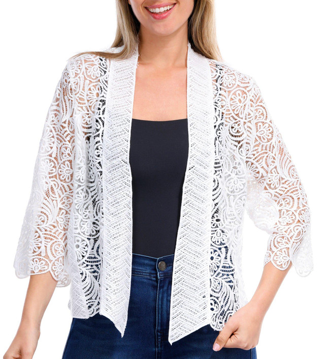 Elevate your outfit with this 3/4 Sleeve Open Shrug. Crafted from delicate lace fabric, this shrug adds a touch of elegance and sophistication to any ensemble. The open design makes it perfect for layering over dresses or tops, while the 3/4 sleeves provide a chic and versatile look.