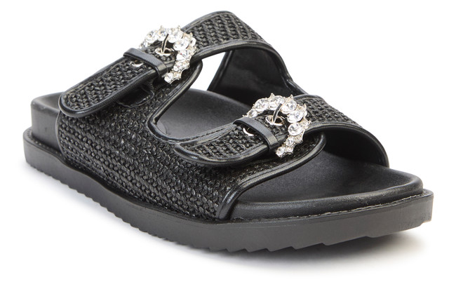 Crystal-embellished straps glam up this woven slide sandal that cushions every step with a contoured footbed and walkable flat sole. Features a synthetic upper, lining and sole.