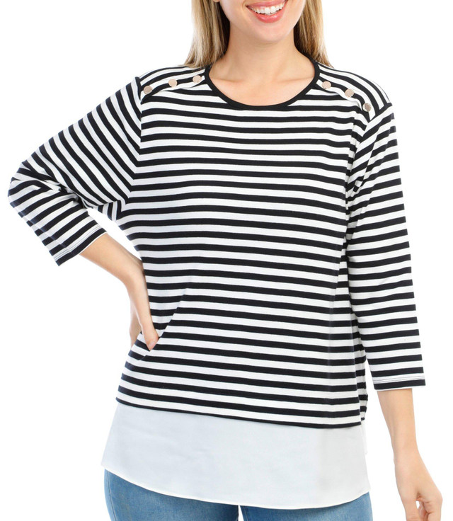 Bring some excitement to your work wardrobe or impress on your next lunch date in this bold Rafaella womens top print pattern. The womens long sleeve shirt is made from a soft fabric thats rib-knit for subtle texture. It has a comfortable classic fit thats flattering without clinging too tight, and its accented with decorative metal buttons on each shoulder that elevate the look even further. 100% Cotton.