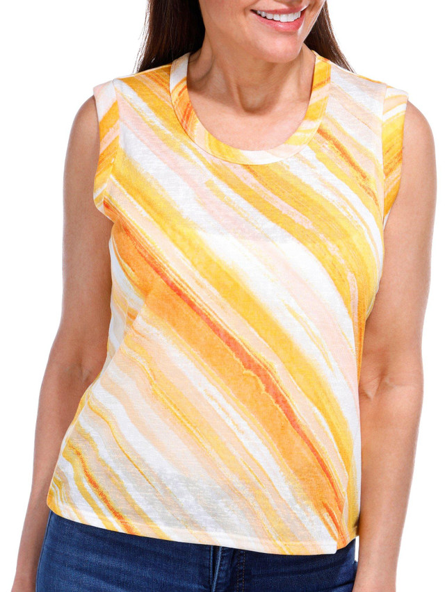 Stay eco-friendly and stylish with this Sleeveless Top, featuring a vibrant print design and roll cuff sleeves. Made from recycled polyester, this top combines sustainability with fashion, offering a comfortable and chic look. Perfect for any occasion, it pairs effortlessly with your favorite jeans or skirts. Whether you're dressing up or keeping it casual, this versatile piece is a must-have addition to your wardrobe. Fabrication is 100% recycled polyester.