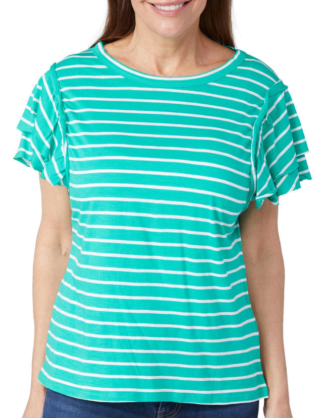The Short Ruffle Sleeve Tee is a charming and comfortable addition to any wardrobe. Crafted from soft jersey fabric, this tee offers a cozy and relaxed fit. The striped print adds a playful and stylish touch, making it perfect for both casual and dressy occasions. The ruffle sleeves provide a feminine and unique detail, ensuring you stand out in any setting. Fabrication is 60% cotton and 40% modal.