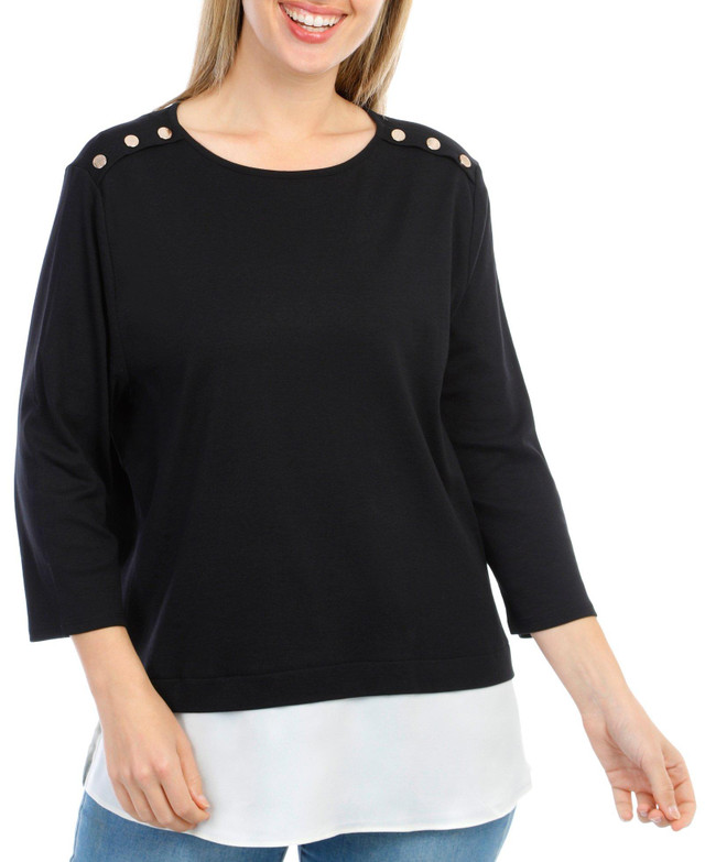 Bring some excitement to your work wardrobe or impress on your next lunch date in this bold Rafaella womens top solid color. The womens long sleeve shirt is made from a soft fabric thats rib-knit for subtle texture. It has a comfortable classic fit thats flattering without clinging too tight, and its accented with decorative metal buttons on each shoulder that elevate the look even further. 100% Cotton.