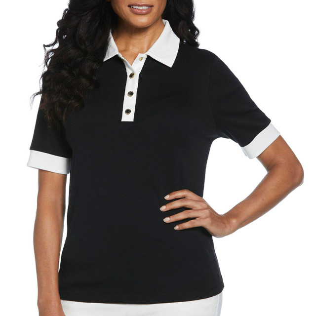 Featuring a polo collar and snap button closure, this elbow-sleeve polo shirt has a polished and timeless look that's never out of place. The solid color design makes it easy to pair with a range of bottoms, making this women's short-sleeved shirt a versatile addition to your everyday rotation.