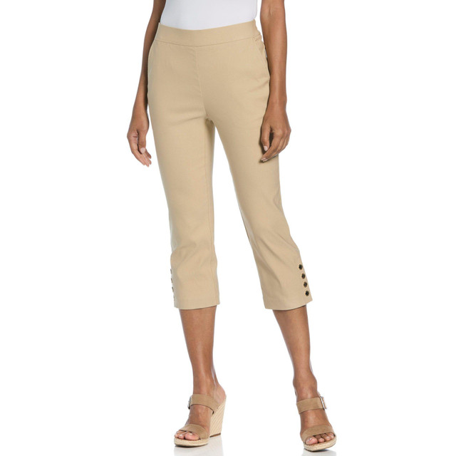 Featuring stretch fabric and a cropped length, these capri pants offer easy, comfortable wear whether you're relaxing on the weekend or working in the office. Front slash pockets add functionality while maintaining a sleek look. These cropped pants come in a solid color design to pair seamlessly with a range of tops in your wardrobe.