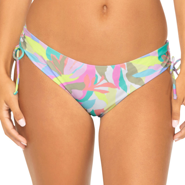 This bikini bottom offers an abstract leaf pattern that'll go great with most swim tops. Tie sides with ruching add extra feminine flair. These women's bikini-cut bottoms from Raisins feature a straight cut across the top and great coverage in the back. Fabric: 82% nylon, 18% spandex.
