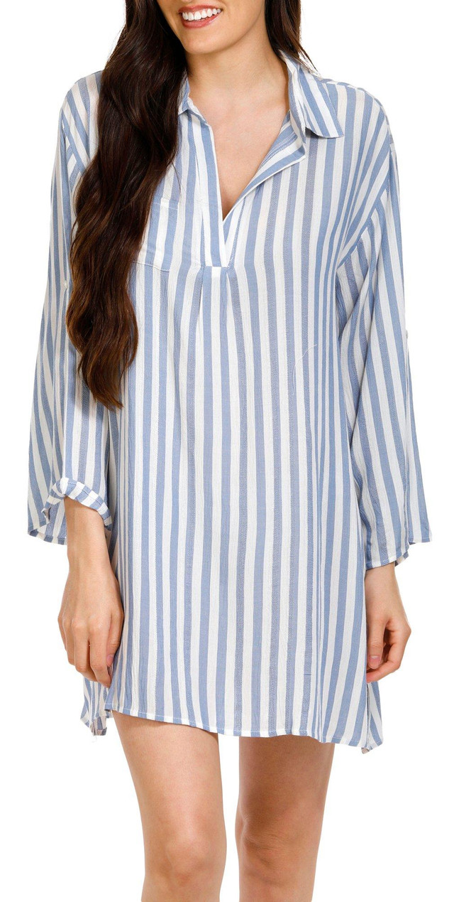 Introducing the Women's Striped Yarn Dye Tunic, crafted from 100% rayon for a soft and breathable feel. This stylish tunic features a chic striped print and a split neckline, adding a touch of sophistication to your look. The chest slip pocket offers a practical detail, while the lightweight design ensures comfort throughout the day. Perfect for casual outings or beachwear, this tunic combines elegance and ease effortlessly.