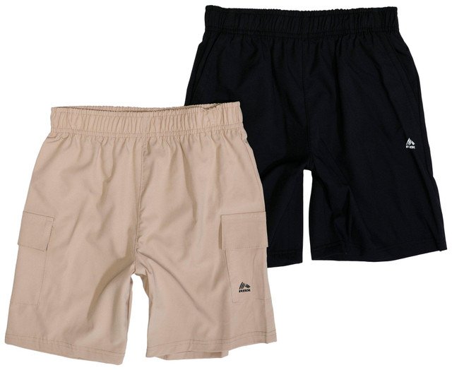 Keep him comfortable and ready for any adventure with this Active Boys Shorts 2 Pack. Featuring one black pair with two front pockets and one khaki pair with functional cargo pockets, this set offers versatility for play and casual outings. Made from lightweight, breathable fabric, these shorts provide all day ease and effortless movement. The elastic waistband ensures a secure fit, making them a go to choice for active days.