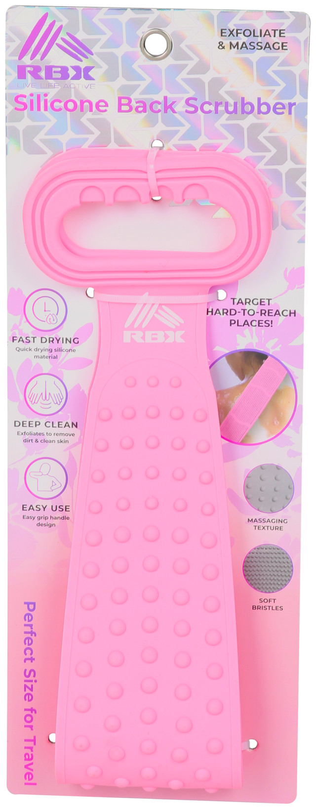 Refresh your routine with the Silicone Exfoliate and Massage Back Scrubber, designed to deep clean and exfoliate hard to reach areas. Fast drying material and an easy grip handle make it simple to use at home or while traveling. Soft bristles help remove dead skin, while the beaded side massages to ease muscle tension. Use with body wash and apply lotion after drying for softer skin. Measures approximately 3.5 in x 24 in.