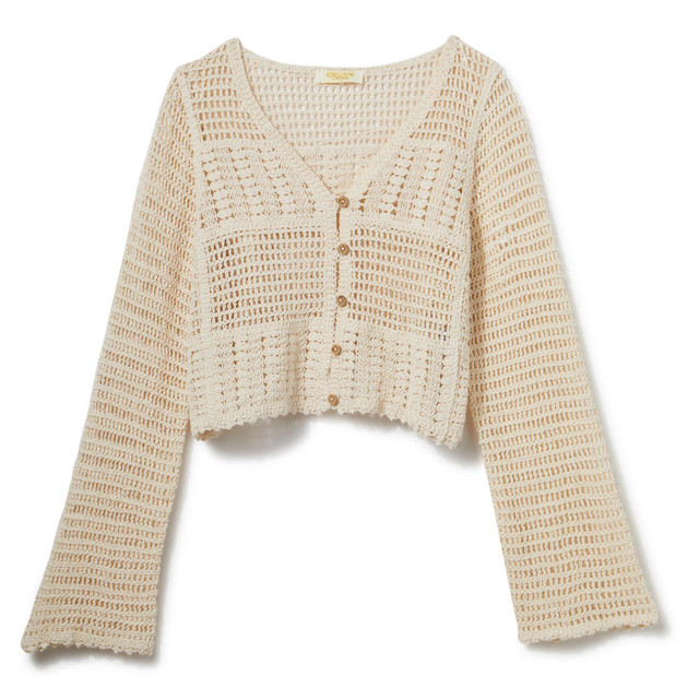 Trendy and textured, the Juniors Long Sleeve Button Front Crochet Top features a cropped silhouette, button-down front, and long sleeves. The crochet design adds a bold, boho-inspired flair that is perfect for layering or wearing solo. Fabrication 100% cotton