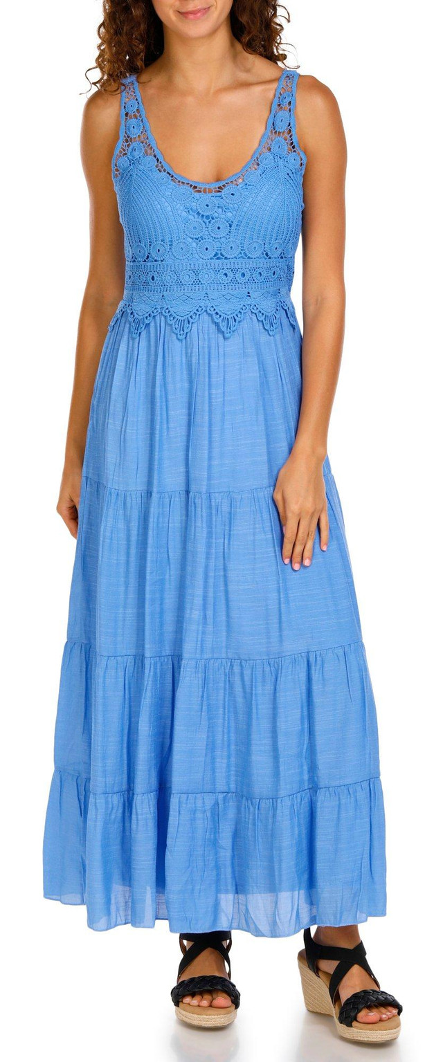 This sleeveless maxi dress features a tiered design and a crochet upper for added texture and charm. Adjustable straps and soft molded cups provide a comfortable, supportive fit. Fully lined for ease and coverage. Fabrication is 58% rayon, 42% polyester.