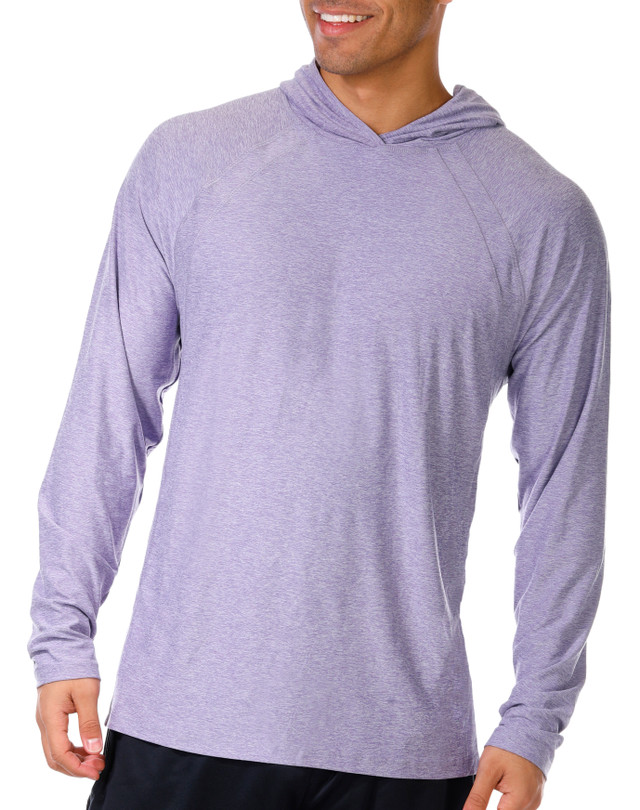 This mens long sleeve performance shirt features a soft heathered finish and a flexible hooded design. Stretchy fabric, sun protection, and quick dry comfort support active days with ease. Made for outdoor plans, workouts, and casual wear with dependable comfort. Top measures approximately 30 in long. Fabrication is 94% polyester and 6% spandex.