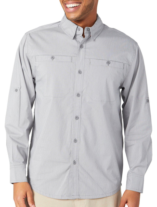 The Men's Long Sleeve Terrain Yarn Dye Button Down Shirt, crafted from a blend of cotton, polyester, and spandex, offers a comfortable and flexible fit. Featuring a solid color, this shirt is designed with a classic collared neckline, practical chest pockets, and roll tab sleeves for added versatility. Perfect for both casual and semi-formal occasions, this piece adds a touch of rugged elegance to any wardrobe.