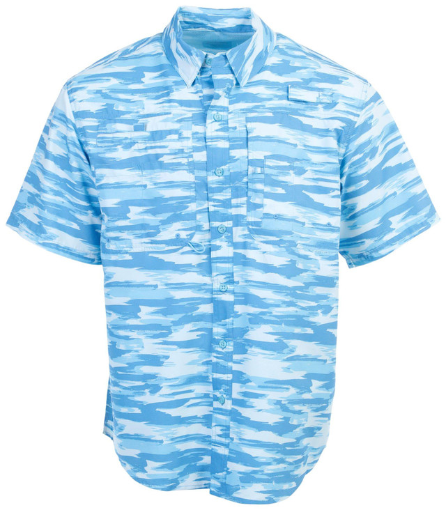 Reel Legends apparel is perfect for any land or sea adventure! This Saltwater short-sleeve shirt features lightweight woven fabric, a point collar, front full button closure, a fully vented back and underarm panel to keep you cool, two front utility chest pockets, a rod holder, UPF 50 sun protection, and moisture-wicking, quick-dry technology and relaxed fit. Fabrication 100% polyester.