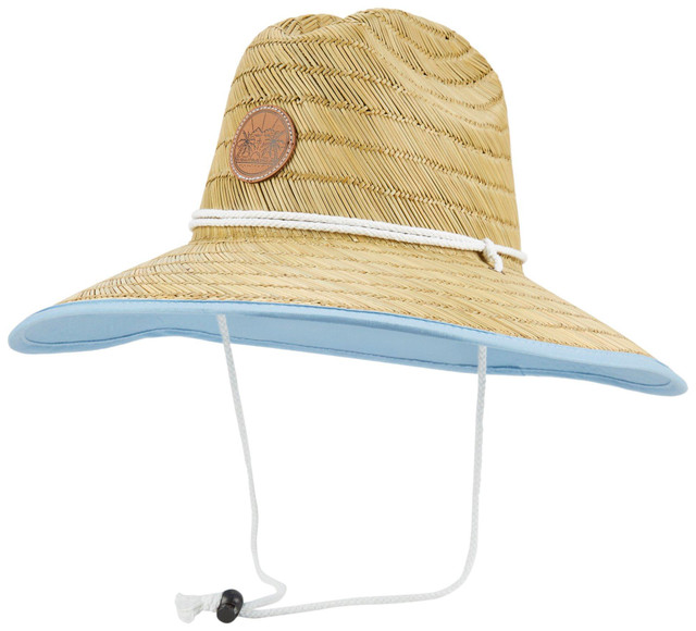 This Mens Lifeguard Hat features a natural straw woven fabrication, solid fabric under the wide brim, a patch on the front, a pinched crown, an interior sweatband, and an adjustable neck cord. Brim measures approximately 4.5 inches. One size fit all. 100% natural.