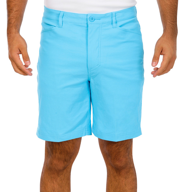 This mens pair of performance shorts features a solid color design with zip and button closure for a secure fit. Built with sun protection, moisture wicking, and quick dry fabric, they also include two front pockets and two back pockets. Ideal for outdoor activities, workouts, or casual warm weather wear. Fabrication is 95% nylon and 5% spandex.