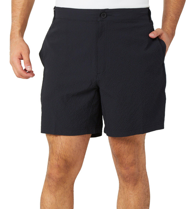 This mens pair of athletic performance shorts features two front pockets for convenience. Designed with sun protection, moisture wicking, and quick dry fabric, these shorts keep you comfortable and dry, making them perfect for workouts, outdoor activities, or casual warm weather wear. Fabrication is 100% polyester.